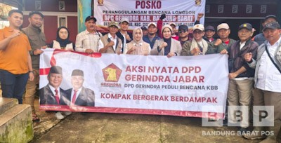 CISARUA,BBPOS- Dewan Pimpinan Daerah (DPD) Partai Gerindra Jawa Barat bersama Dewan Pimpinan Cabang (DPC) Partai Gerindra Kabupaten Bandung Barat (KBB) kompak turun langsung membantu para korban bencana longsor dengan menyalurkan bantuan logistik serta layanan kesehatan di Desa Pasirlangu, Kabupaten Bandung Barat, Minggu (25/1).