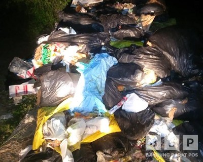 CIKALONG,BBPOS- Akses utama warga Kampung Cileunca, RT 05 RW 10, Desa Tenjolaut, Kecamatan Cikalongwetan, Kabupaten Bandung Barat (KBB), lumpuh total setelah tumpukan kantung plastik berisi limbah medis dibuang di tengah jalan.